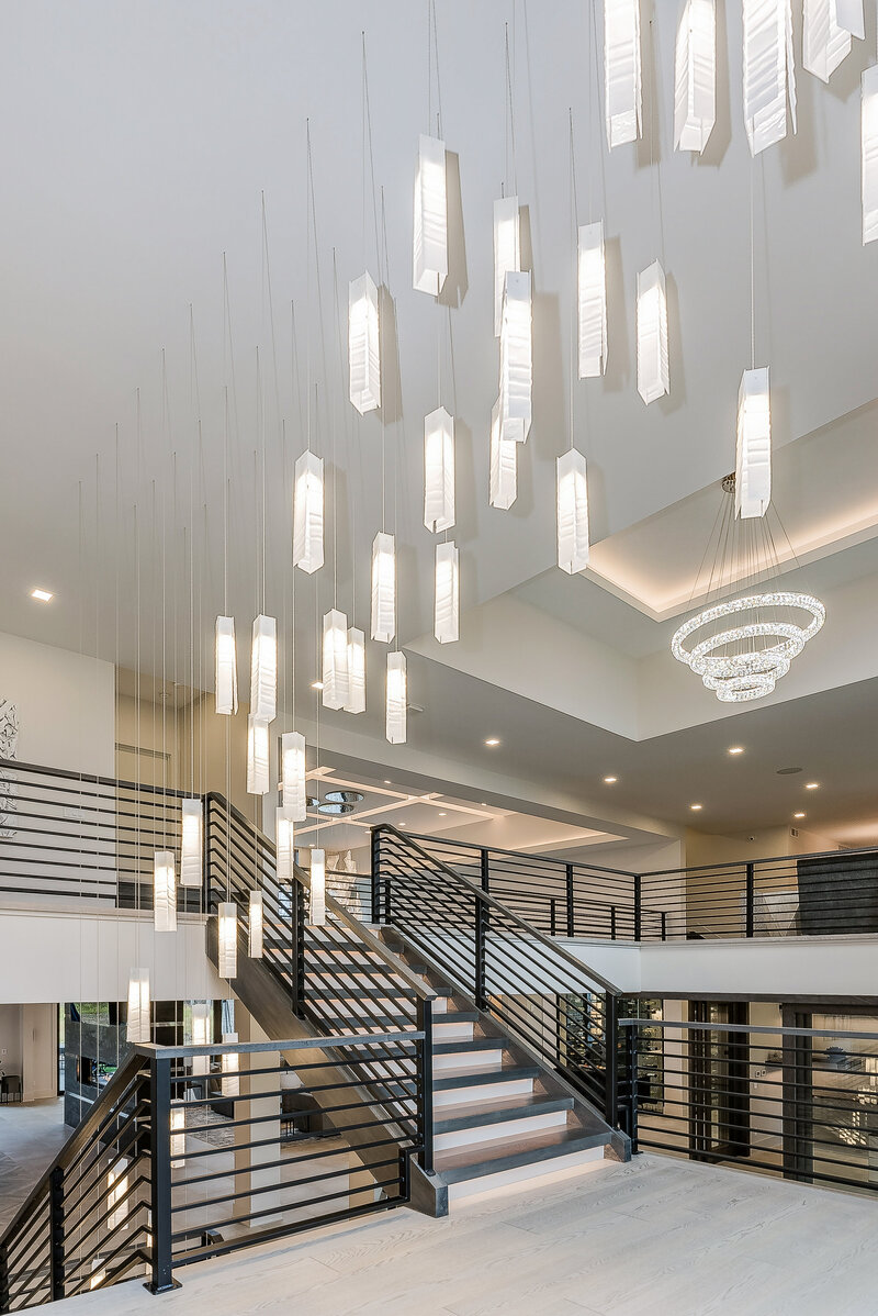 As this was our first collaboration with Ruggiero Custom Homes, we approached Modern Luxe as a true design partnership—melding architectural vision with immersive, detail-driven interiors. Our team led the full interior development, including a custom lighting installation that cascades from the second floor to the basement like a glass waterfall. Floor-to-ceiling features and layered lighting bring drama to each space, while curated artwork provides bold, refined contrast against the home’s monochromatic foundation. In every room, from the serene primary suite with sauna to the entertainment-ready basement, we ensured luxury met livability—proving that modern design can still feel warm, personal, and entirely at home.